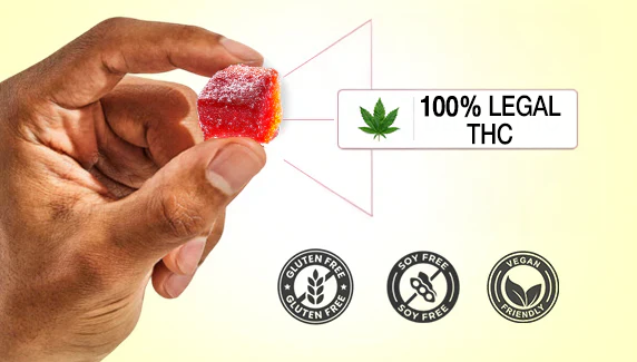 Each Space Chew gummy weighs 4.4 grams (or 4400 mg). So with 10mg of THC in each gummy, that's 0.227% of the whole gummy’s weight (less than 0.3%), making it 100% legal.