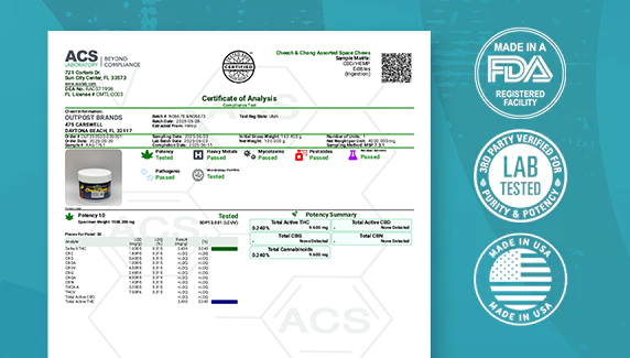 Space Chews (and all Cheech & Chong products) are manufactured in an FDA registered facility, and are 3rd party lab-tested for safety and purity. You can see all of our lab reports right here.